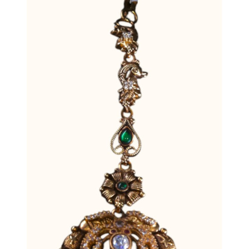 This is a Maang Tikka, a traditional piece of Indian jewelry worn on the forehead, crafted from 92.5 sterling silver with a gold-polished finish. The Maang Tikka features a central, intricately designed pendant. Based on the visual evidence, the pendant includes several gemstone accents, appearing to be a mix of clear or white stones, ruby or pink-colored stones, and a prominent green stone at the top. The design incorporates traditional motifs, possibly depicting peacocks or other auspicious symbols, along with delicate filigree work. The pendant is further embellished with dangling pearl-like beads. The chain or string that extends from the pendant to the hairline is also gold-polished and features decorative elements, including a green gemstone and a floral motif. This piece is designed for decorative purposes and is likely worn for traditional occasions, weddings, or festive events. The style suggests it could be part of a "Temple Gold" jewelry collection, known for its intricate designs and gemstone accents in a gold-toned setting.