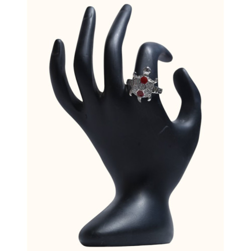 This is a charming 92.5 sterling silver ring featuring a detailed turtle or tortoise design. The turtle's shell is likely adorned with small, vibrant ruby-colored stone accents, adding a touch of sparkle and color to the design. The silver has a polished finish, highlighting the intricate details of the turtle's body and shell. The band of the ring is slender and complements the detailed turtle centerpiece. This ring is a delightful and symbolic piece, perfect for those who appreciate nature-inspired jewelry.