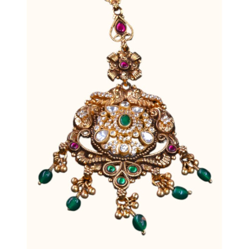 This is a Maang Tikka, a traditional piece of Indian jewelry worn on the forehead, crafted from 92.5 sterling silver with a gold-polished finish, exhibiting an antique style. The Maang Tikka features a central, ornate pendant with intricate filigree work and numerous gemstone accents. Based on the visual evidence, the pendant includes a prominent central green gemstone, surrounded by smaller clear or white stones and further accented with ruby or pink-colored stones. The design incorporates traditional motifs, possibly depicting deities or floral patterns. The pendant is embellished with dangling elements, including small gold-polished beads and larger, dark green drop-shaped beads. The chain or string that extends from the pendant to the hairline is also gold-polished and features decorative segments with additional gemstone accents. This piece is designed for decorative purposes and is likely worn for traditional occasions, weddings, or festive events. The overall design and finish suggest it aligns with "Temple Gold" or antique-style jewelry.