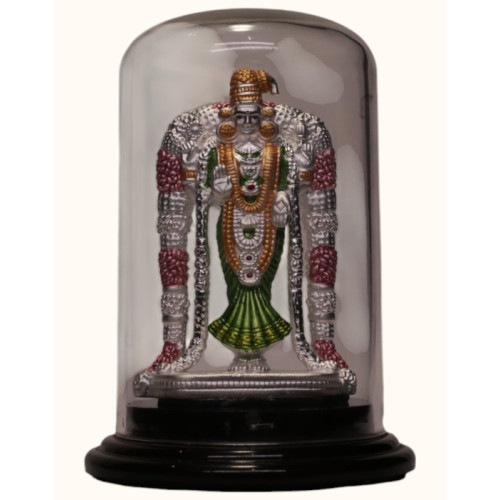 Invite divine blessings and prosperity into your home with this beautifully crafted 92.5 sterling silver idol of standing Lord Balaji (Venkateswara). The intricately detailed figure is adorned with vibrant enamel accents in gold, green, and maroon, highlighting his majestic form and divine ornaments. This sacred representation of Lord Vishnu is elegantly displayed within a clear glass dome atop a classic black base, making it a cherished addition to your home altar, a meaningful gift for devotees, or a precious piece in your spiritual collection.