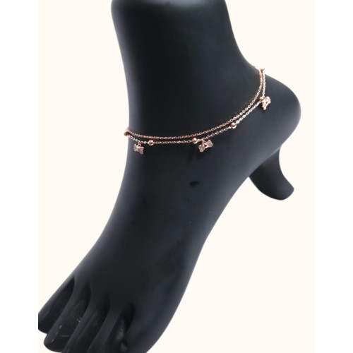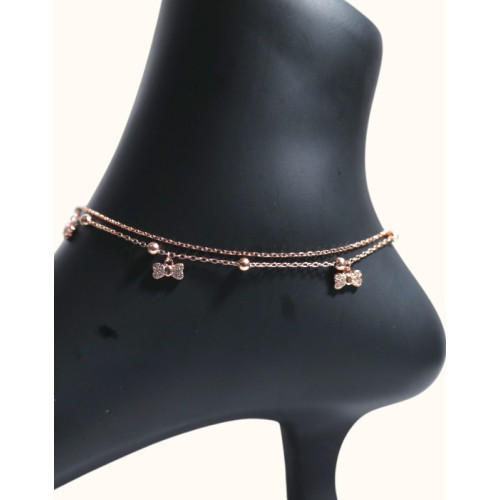 This is an elegant Italian Rose Gold anklet featuring delicate bow-shaped charms encrusted with shimmering stones, suspended between dainty rose gold beads. The dual-layered chain design adds depth and sophistication, making it a graceful adornment for any occasion. Whether you're dressing up for a celebration or adding flair to your daily wear, this anklet delivers subtle luxury and feminine charm.
