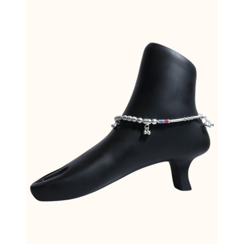 Adorn your ankle with the playful charm of this 92.5 sterling silver anklet. Featuring a fine ball chain, this delicate piece is embellished with intricately textured silver beads and a vibrant section of red and blue enamel accents. Dangling gracefully from the chain are small, traditional silver bells (ghungroos) that create a soft, melodious jingle with every step. This anklet offers a delightful combination of texture, color, and sound, perfect for adding a touch of traditional flair to your everyday style or festive attire.