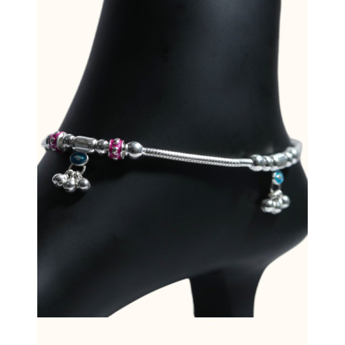 Adorn your ankle with the delightful charm of this 92.5 sterling silver anklet. Featuring a sleek snake chain, this piece is embellished with textured silver beads, vibrant pink enamel accents, and sparkling light blue gemstone charms. Dangling gracefully from the chain are clusters of small, traditional silver bells (ghungroos) that create a soft, melodious jingle with every step. This anklet offers a beautiful combination of texture, color, sparkle, and sound, perfect for adding a touch of traditional elegance and playful movement to your style.