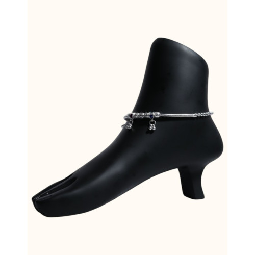 Adorn your ankle with the intricate detail and playful sound of this 92.5 sterling silver anklet. Featuring a subtly braided chain, this piece is embellished with textured silver beads and vibrant enamel accents in shades of red and blue. Dangling gracefully from the chain are small, sparkling gemstone charms in ruby red and sapphire blue, along with clusters of traditional silver bells (ghungroos) that create a soft, melodious jingle with every step. This anklet offers a beautiful combination of texture, color, sparkle, and sound, perfect for adding a touch of traditional charm and lively movement to your style.