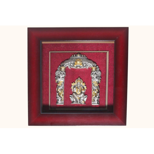 This is a framed idol of Lord Ganesha, a popular Hindu deity known as the remover of obstacles and the god of beginnings, set under an ornate arch. The idol and the arch appear to be crafted from silver or silver-toned metal, with gold-toned accents highlighting details. Lord Ganesha is depicted seated, adorned with jewelry and holding his characteristic attributes. The archway is intricately designed with pillars and decorative elements, also featuring gold-toned details. The ensemble is set against a dark red, possibly velvet, backing within a rectangular frame. The frame itself is a reddish-brown wood with a double border. This framed object appears to be a devotional piece, intended for display and worship.