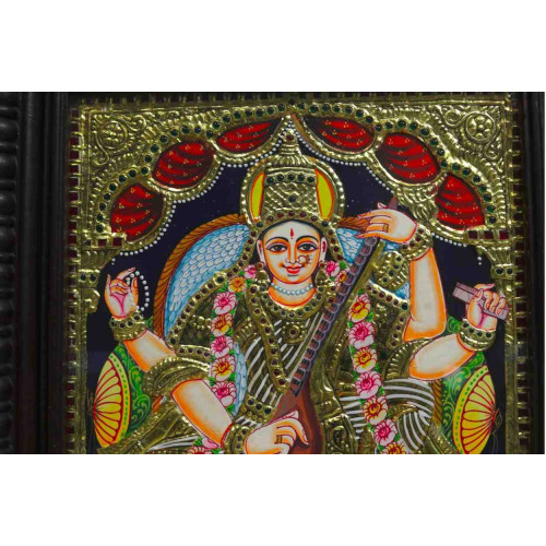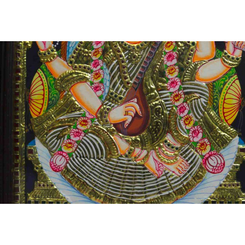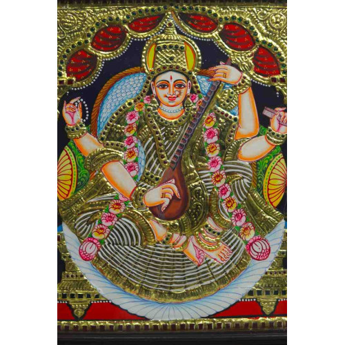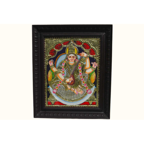 This is a Tanjore painting depicting Goddess Saraswati, the Hindu goddess of knowledge, music, arts, wisdom, and learning. Tanjore paintings are a classical South Indian art form characterized by their rich colors, use of gold foil, and intricate detailing. The painting shows Goddess Saraswati seated gracefully on a white lotus or a swan, holding her characteristic veena (a stringed musical instrument) and often a book or rosary, symbolizing knowledge and wisdom. She is adorned with elaborate jewelry and flowing garments, richly highlighted with gold foil that adds a shimmering, three-dimensional effect. The background is typically a deep color, such as navy blue or black, which contrasts beautifully with the vibrant colors of the goddess and the brilliance of the gold. The painting is likely framed, further enhancing its traditional and sacred aesthetic.