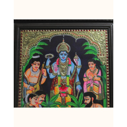 The painting portrays Lord Sathyanarayana Swamy standing under an ornate arch, typically with a serene expression and a blue complexion. He is adorned with elaborate gold jewelry, a majestic crown, and holds symbolic attributes such as a conch shell (Shankha) and a discus (Chakra). Surrounding him are other figures, likely representing devotees, priests, or celestial beings, often engaged in worship or listening to the Sathyanarayana Katha. The painting prominently features the use of radiant gold foil for the deity's ornaments, the architectural elements of the arch, and decorative borders, creating a shimmering and opulent three-dimensional effect. The background is a dark color, possibly black or deep blue, which beautifully contrasts with the vibrant colors and the gleaming gold. The painting is housed in a dark, possibly wooden, frame with a decorative border, enhancing its traditional and devotional aesthetic.