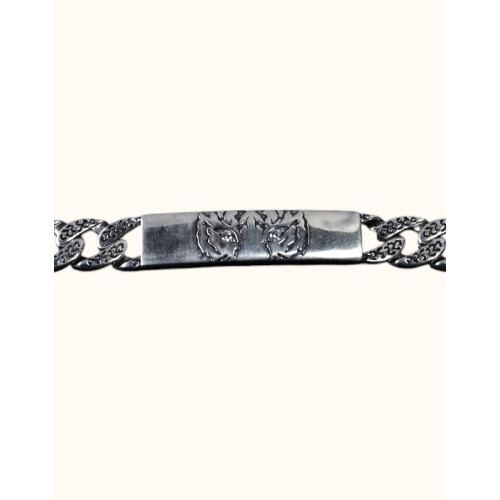 This is a distinctive and bold ID bracelet crafted from 92.5 sterling silver with an oxidized finish, giving it a slightly vintage and rugged look. It features a sturdy curb chain, characterized by its interconnected, flattened, and twisted oval links that lie flat against the wrist. The central element is a rectangular ID plate with a detailed engraving of two facing tiger heads, symbolizing strength, power, and courage. The oxidized silver enhances the engraved details, making them stand out. The bracelet is finished with a secure clasp for comfortable and reliable wear. This sterling silver curb chain ID bracelet with engraved tiger heads is a statement accessory for those who appreciate unique and meaningful jewelry.