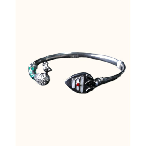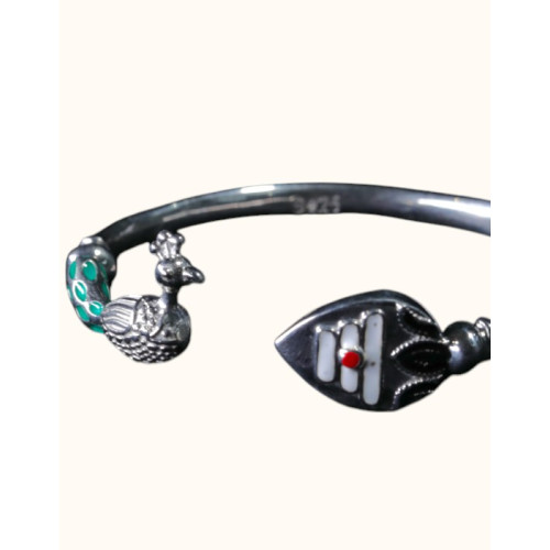 Celebrate culture with this intricately crafted oxidized silver kaapu designed for men. One end features a beautifully detailed peacock with colored enamel accents, while the other end showcases a symbolic Trishul (trident) with traditional markings, embodying spiritual energy and divine protection. The open-end design allows easy wearing, making it both a sacred and stylish accessory for the modern devotee.