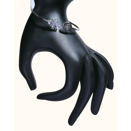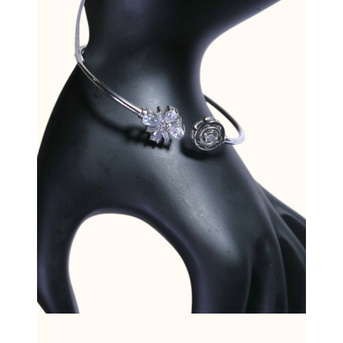 Celebrate timeless charm with this elegant open kada, featuring a dainty floral motif on one end and a beautifully sculpted rose on the other. Crafted with a sleek silver finish and adorned with sparkling white stones, this design embodies both grace and contemporary appeal. A perfect choice for women who adore floral elegance with a modern twist.